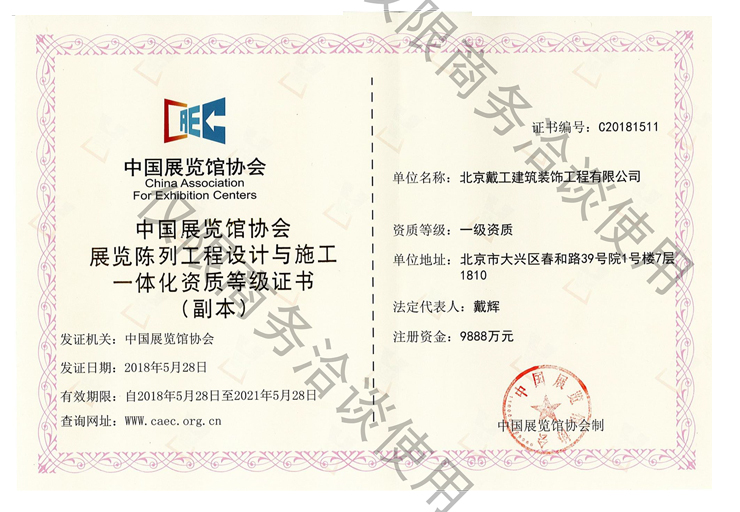 戴工建設集團有限公司,創建于2009年,注冊資本9888萬元人民幣。公司位于北京市大興區。具有建委頒發的建筑裝飾裝修專業壹級,防水保溫工程專業壹級,建筑幕墻專業貳級,消防設施專業貳級,電子與智能化專業貳級,特種工程(結構補強)專業不分等級,建筑機電安裝專業貳級,環保工程專業貳級,鋼結構專業貳級,建筑工程總承包貳級,建筑裝飾工程設計專項甲級,展覽陳列工程設計與施工壹級,展覽展示工程壹級...更多>>